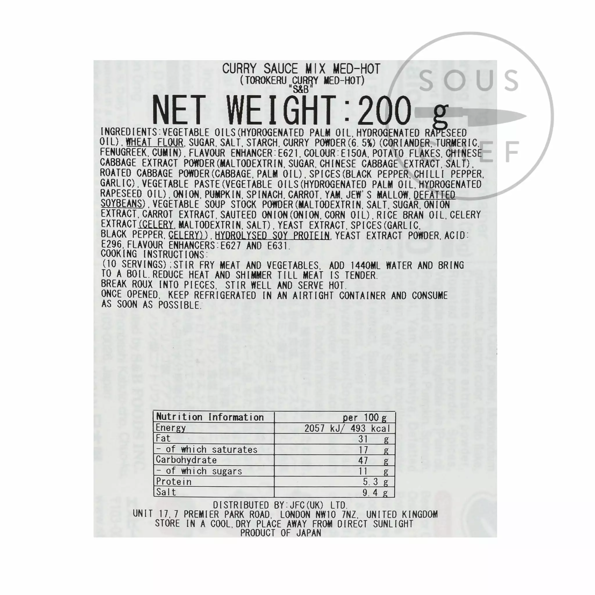 Ingredients: vegetable oils (hydrogenated palm oil, hydrogenated rapeseed oil), wheat flour, sugar, salt, starch, curry powder 6.5% (coriander, turmeric, fenugreek, cumin), flavour enhancer: E621, colour: E150A, potato flakes, Chinese cabbage extract powder (maltodextrin, sugar, Chinese cabbage extract, salt), roated cabbage powder (cabbage, palm oil), spices (black pepper, chilli pepper, garlic), vegetable paste (vegetable oils (hydrogenated palm oil, hydrogenated rapeseed oil), onion, pumpkin, spinach, carrot, yam, jew’s mallow, defatted soybeans), vegetable soup stock powder (maltodextrin, salt, sugar, onion extract, carrot extract, sauteed onion (onion, corn oil), rice bran oil, celery extract (celery, maltodextrin, salt), yeast extract, spices (garlic, black pepper, celery), hydrolysed soy protein, yeast extract powder, acid E296, flavour enhancers: E627, E631. Allergens are listed in bold.