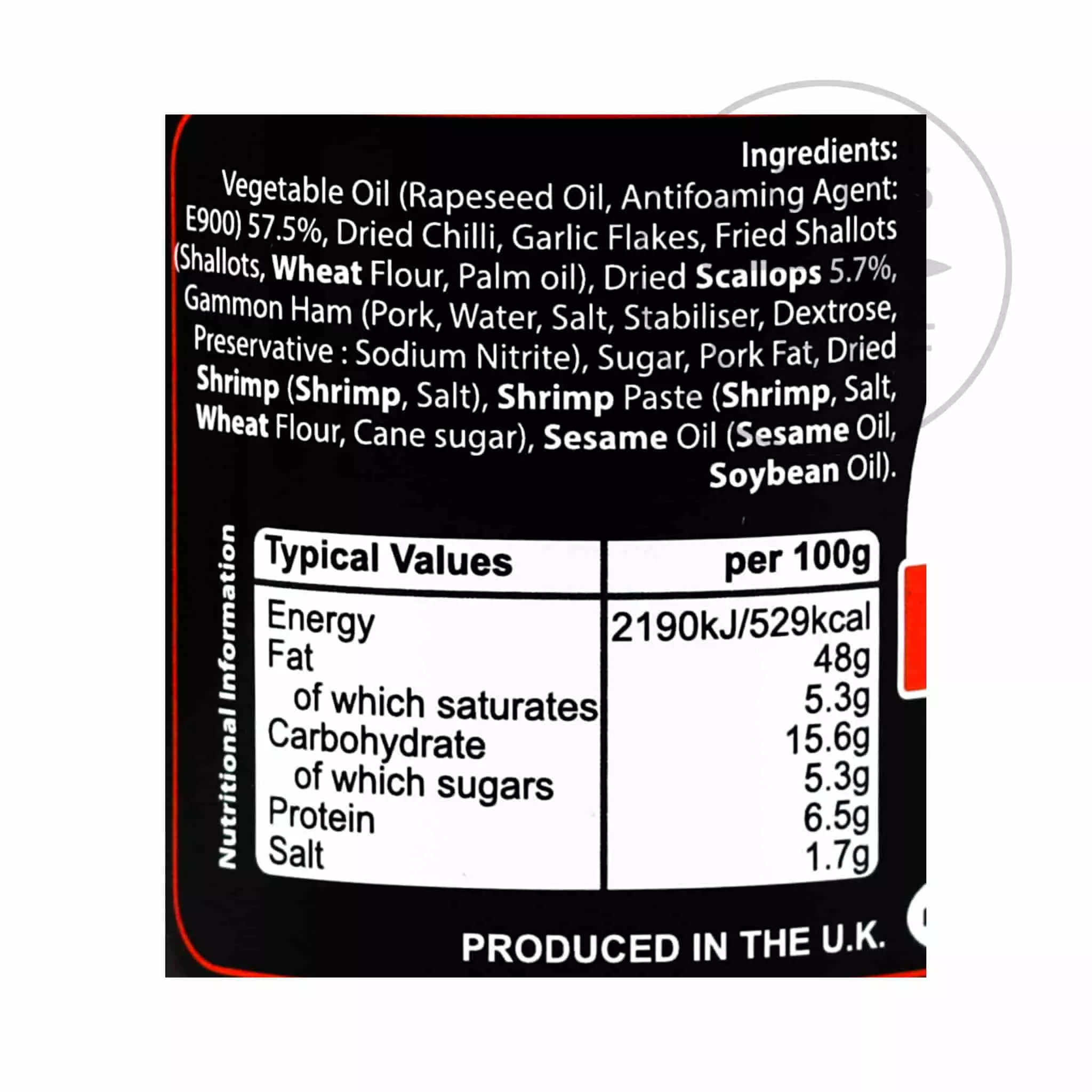 Ingredients: vegetable oil (rapeseed oil, antifoaming agent: E900) 57.5%, dried chilli, garlic flakes, fried shallots (shallots, wheat flour, palm oil), dried scallops 5.7%, gammon ham (pork, water, salt, stabiliser, dextrose, preservative: sodium nitrate), sugar, pork fat, dried shrimp (shrimp, salt), shrimp paste (shrimp, salt, wheat flour, cane sugar), sesame oil (sesame oil, soybean oil).
