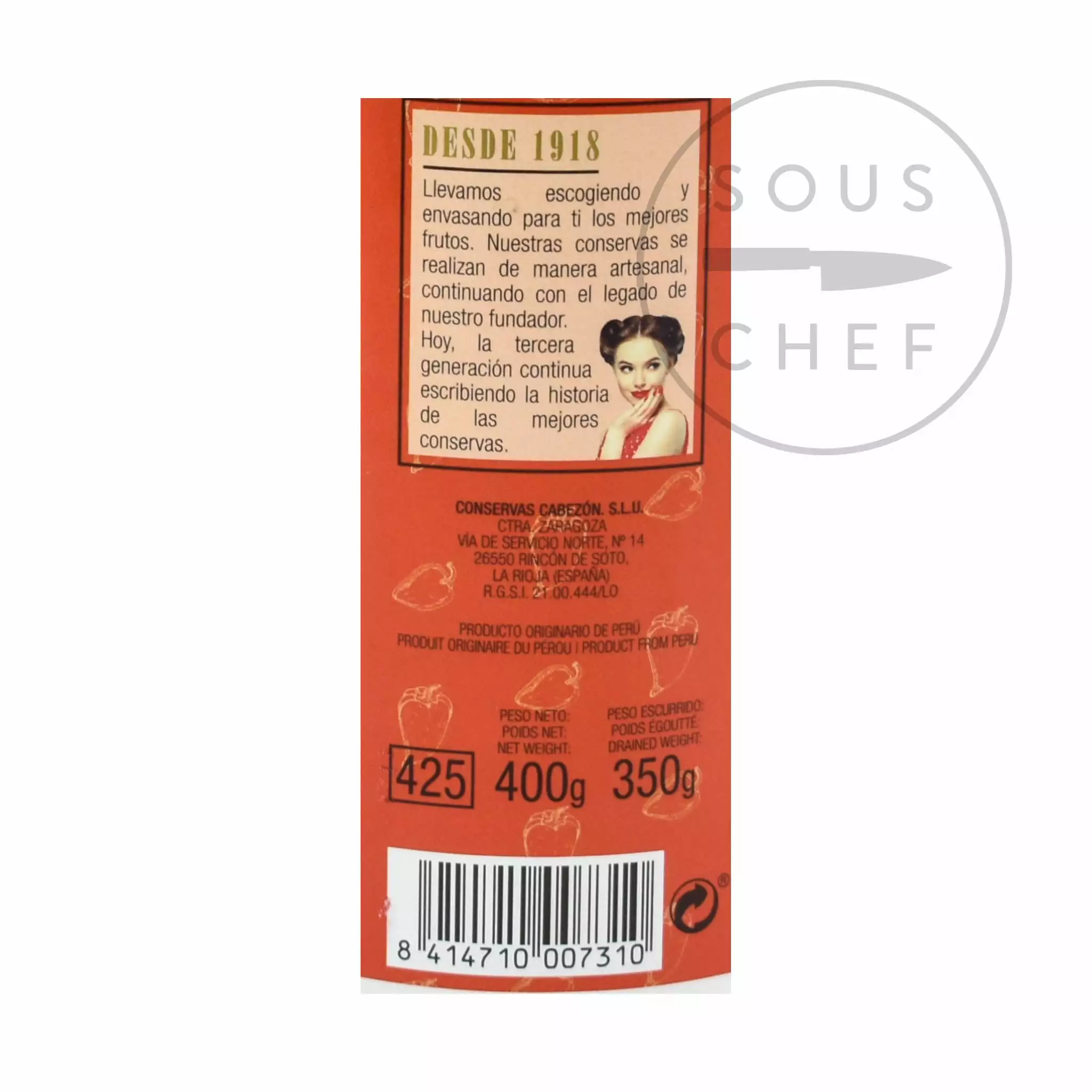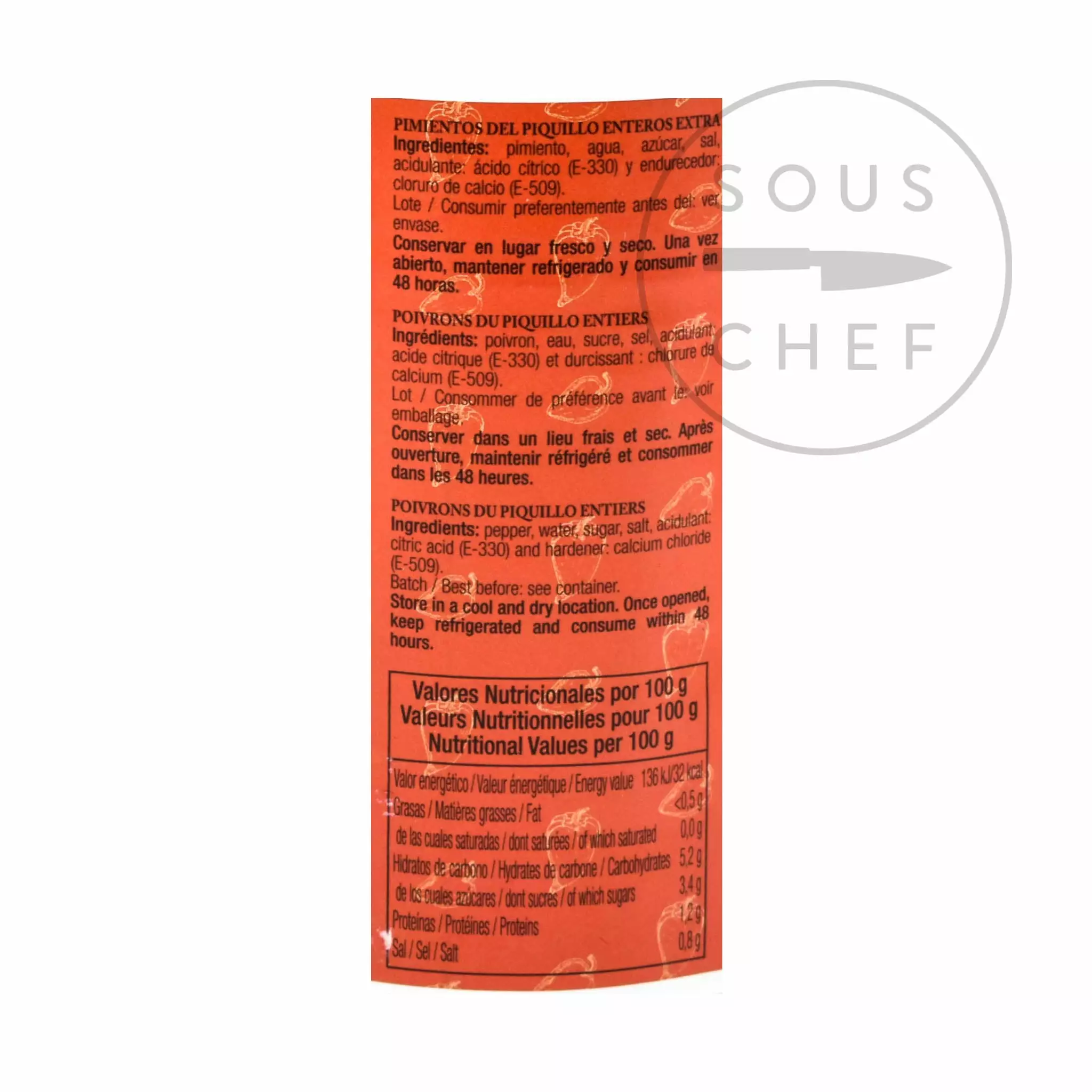 Ingredients: Pepper, water, sugar, salt, acidulant: citric acid (E-330) and hardener: calcium chloride (E-509)