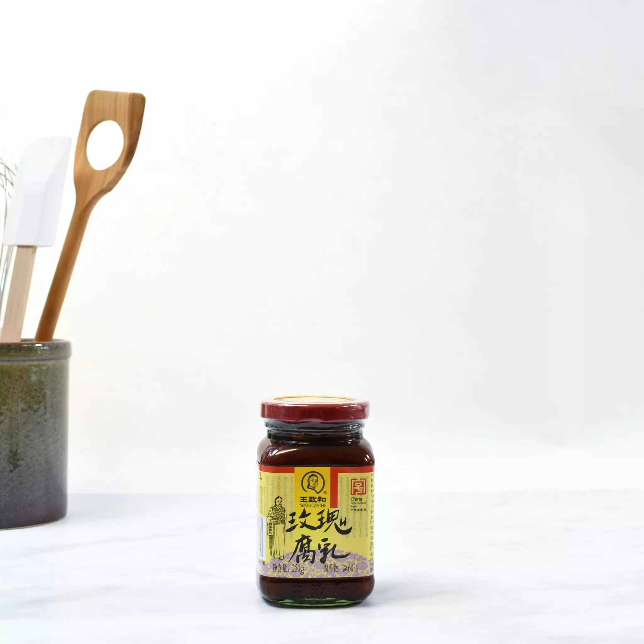 Preserved rose bean curd is used widely in Chinese marinades and sauces – it gives you the deep scarlet red in Chinese BBQ pork char siu, and colours and flavours braises with a gentle saltiness. Rose bean curd or ‘rose essence fermented tofu’ is very similar to preserved red beancurd. It is made and used in the same way, and has the same deep red colour – but also includes a touch of rose essence for extra flavour.