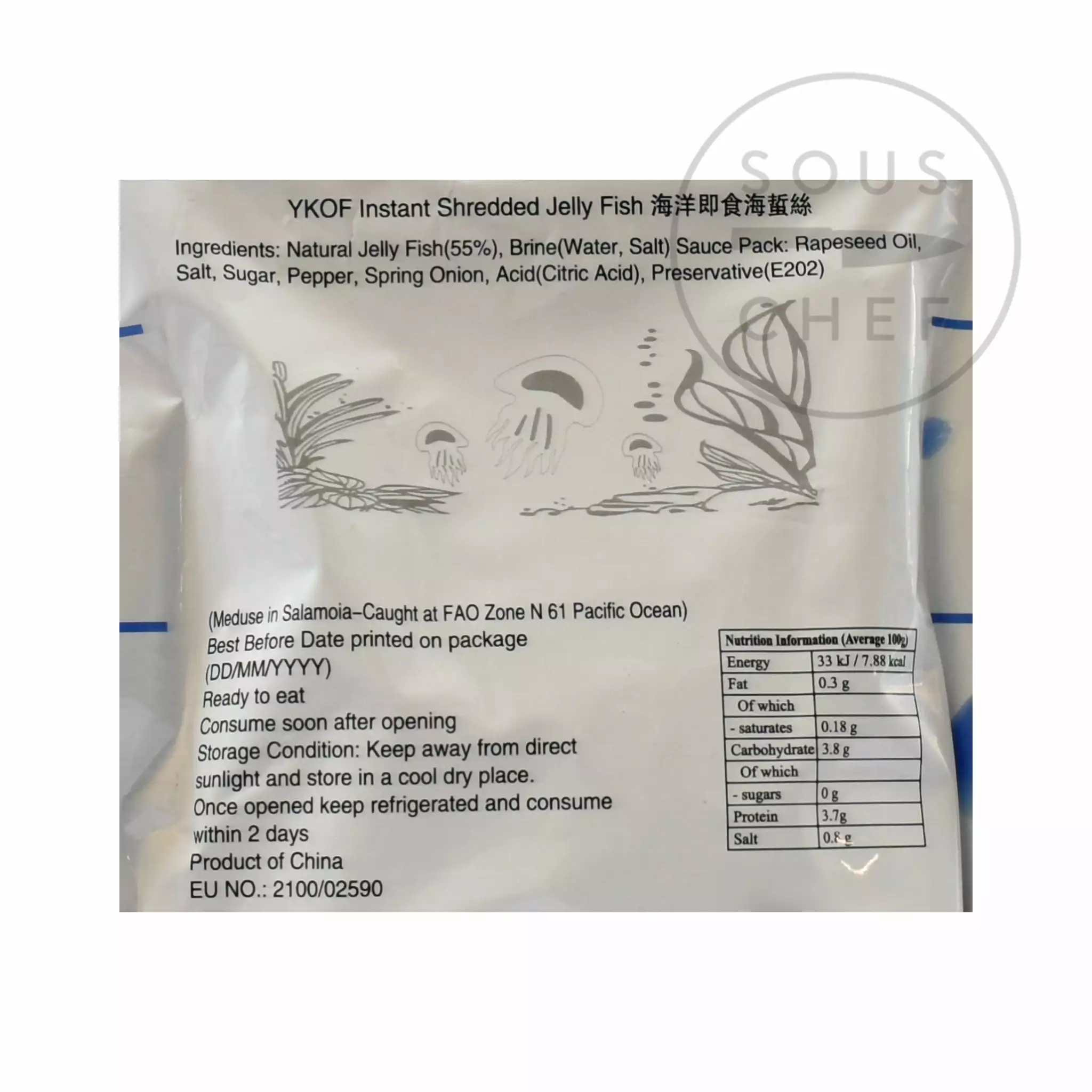 Ingredients: jellyfish (55%), brine (water, salt.) Seasoning pack: rapeseed oil, salt, sugar, pepper, spring onion, citric acid, preservative E202.